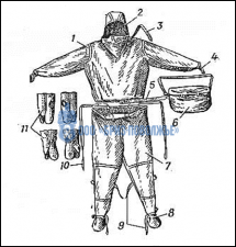 Костюм изготавливается из прорезиненных материалов Т-15 или УНКЛ серого или зеленого цвета соответственно.